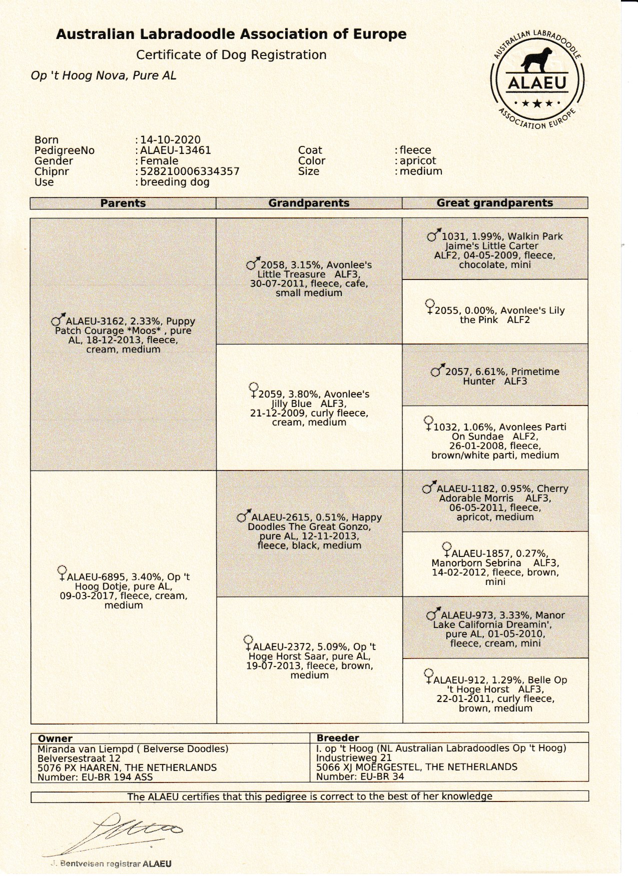 Nova is ons eerste fokteefje voor Belverse Doodles. Ze heeft een prachtig apricot kleurige fleece vacht. Nova is een super lieve knuffelhond en een echt allemansvriendje. Ze geniet echt van het buiten zijn en speelt graag met haar dochter Soof en vriendinnetje Jack Russell Jip.